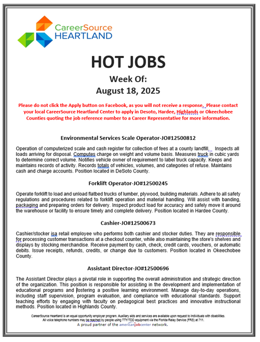 CareerSource Heartland provides employment and training related services at no cost to you.